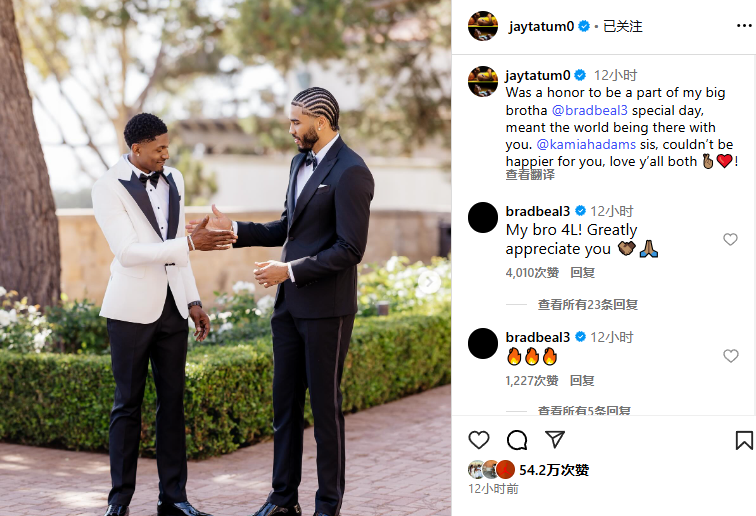 凯尔特人球星塔图姆在社媒上晒出更多合影祝贺比尔完婚,配文写道:很荣幸能参与我大哥布拉德利-比尔的特殊日子,能和你一起在那里对我意味着全世界。卡米亚-亚当斯姐姐,我为你感到无比高兴,爱你们。